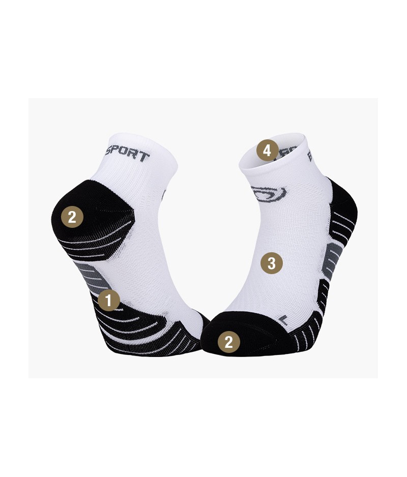 Les renforts au niveau du talon et de la pointe améliorent l'amorti, réduisent les échauffements et préviennent les ampoules. Les coutures plates assurent un confort supplémentaire.